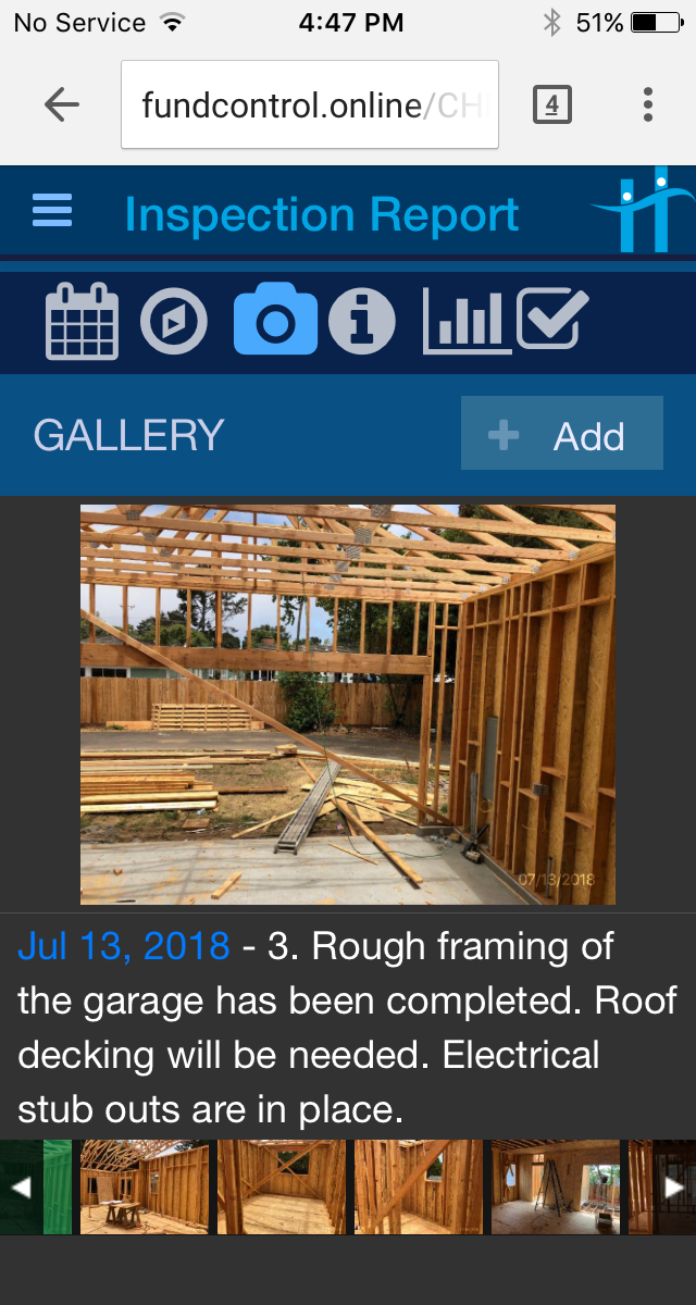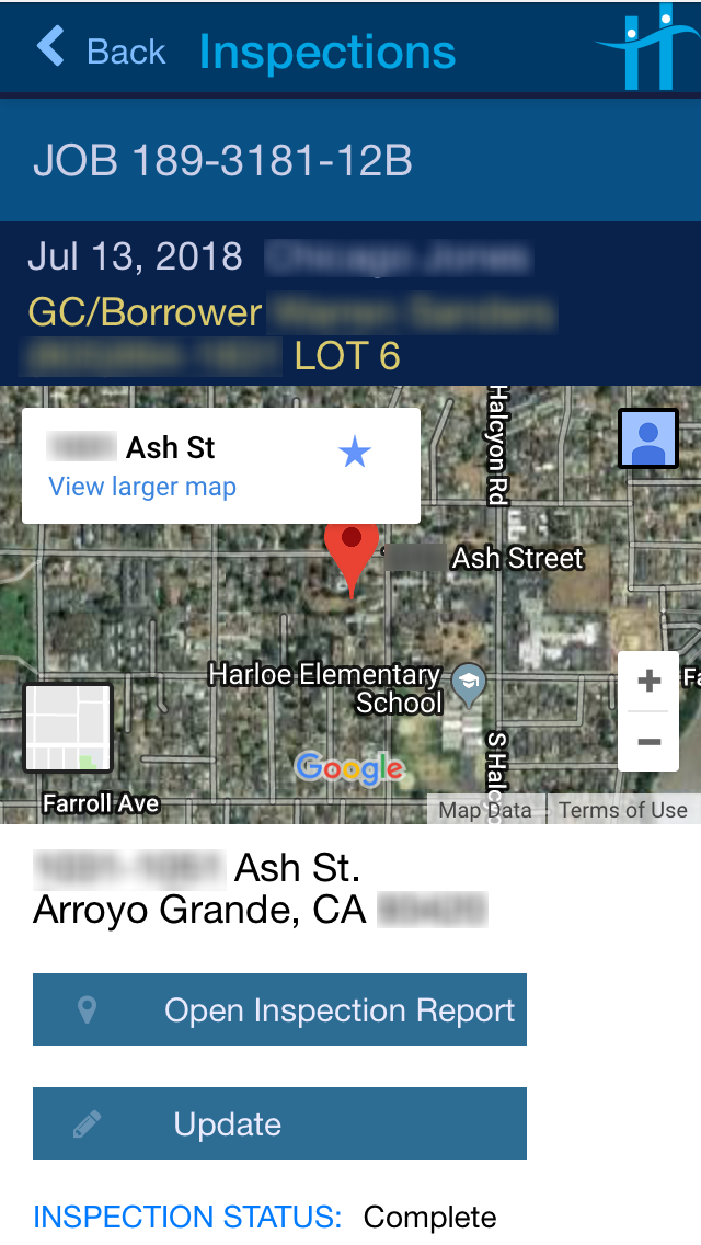 Scheduled jobs are routed to inspectors, who use a mobile phone or tablet to photograph and report the status of building line items, site conditions, and project progress.
